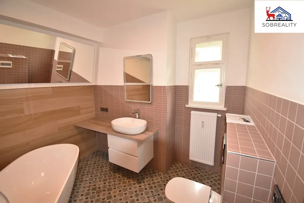Pronájem krásného bytu ve vile Flora o dispozici 1+1 v OV o výměře cca 46 m2. V jedné z nejlepších a nejvyhledávanějších lokalit města Teplice ul. Poštovní. Byt prošel kompletní rekonstrukci a doposud v něm nikdo ještě nebydlel. A je situován ve 3. nadzemním podlaží (2. patro). Tento byt se skládá z obývacího pokoje cca 26 m2 a součástí obývacího pokoje je i vestavěná šatna cca 2,3 m2, kuchyně cca 3,3 m2, koupelny včetně toalety cca 7 m2, chodby (předsíně) cca 7 m2. Vytápění bytu a ohřev teplé vody je zajištěn centrálním plynovým kotlem. V domě je také instalována plošina pro vozíčkáře. Veškerá občanská vybavenost v dosahu. Byt je k dispozici ihned. A je maximálně pro dvě osoby.