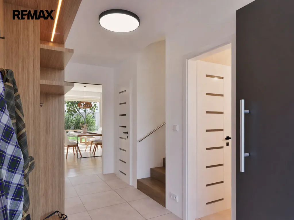 V přízemí domu bude vstupní chodba se schodištěm do patra, kde při vstupu budete mít po pravé straně koupelnu se sprchovým koutem a WC, na levé straně bude výklenek pro vestavěnou šatní skříň. Dále menší pokoj vhodný jako ložnice nebo pracovna. Rovně z chodby projdete do velkého obývacího pokoje, který bude spolu s velkým kuchyňským koutem a jídelnou dominantou celého domu. Z tohoto obývacího pokoje bude vstup na zahradu s terasou, kde můžete umístit pergolu. Zahrada bude oplocená se zadní brankou pro pěší vstup. V chodbě pod schodištěm budete mít úložný prostor a v patře na vás budou čekat tři pokoje a hlavní koupelna s vanou a WC. Jako bonus vám zhotovíme plnohodnotnou velkou místnost v podkroví, kam povede schodiště. Podkrovní pokoj bude mít všechny náležitosti jako jsou střešní okna, podlahovou krytinu, sádrokartonové podhledy i rozvody elektřiny. Tento podkrovní prostor můžete využít jako ložnici, pracovnu nebo hernu. Velkoformátová okna zajistí dostatek přirozeného světla a příprava na venkovní žaluzie umožní regulaci teploty v interiéru. Před domem budou dvě parkovací stání.