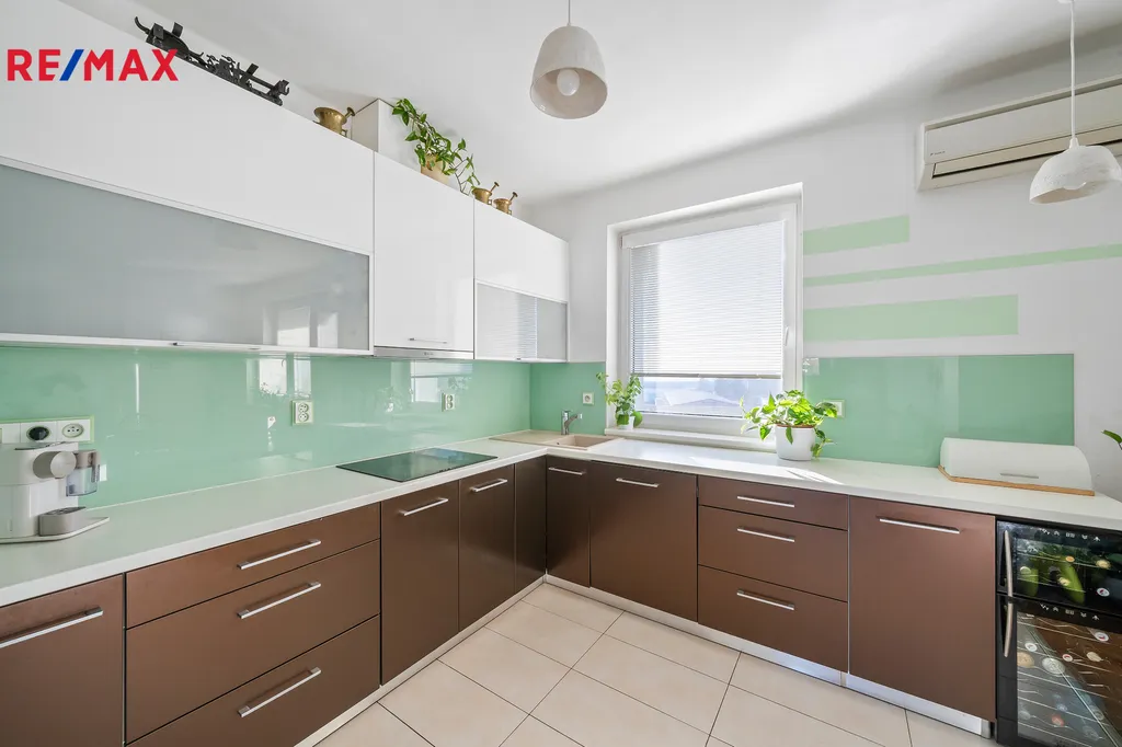 Dominantou bytu je prostorná kuchyň propojená s obývacím pokojem, ze kterého je vstup na balkon. Druhý balkon je přístupný z jednoho ze samostatných pokojů. Kuchyňská linka je vybavena vestavěnými spotřebiči – mikrovlnnou troubou, elektrickou troubou, sklokeramickou varnou deskou a digestoří. V obývacím pokoji na naistalována klimatizace.