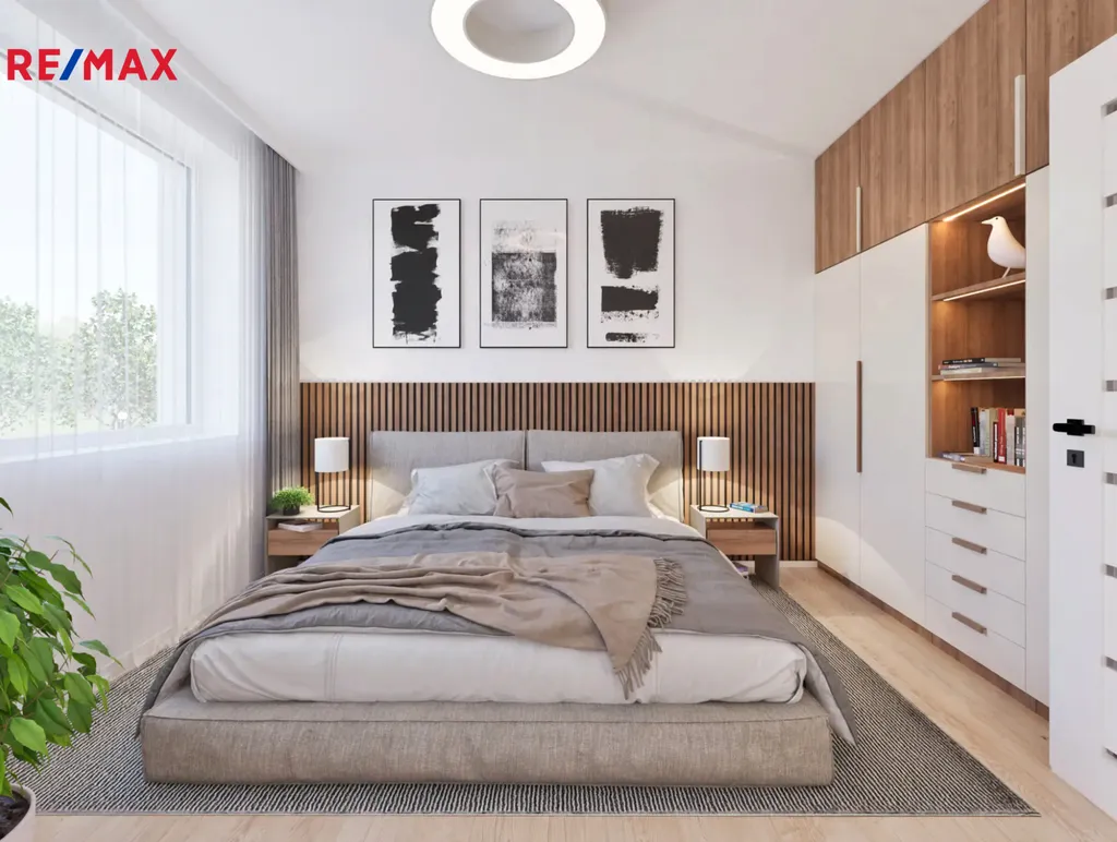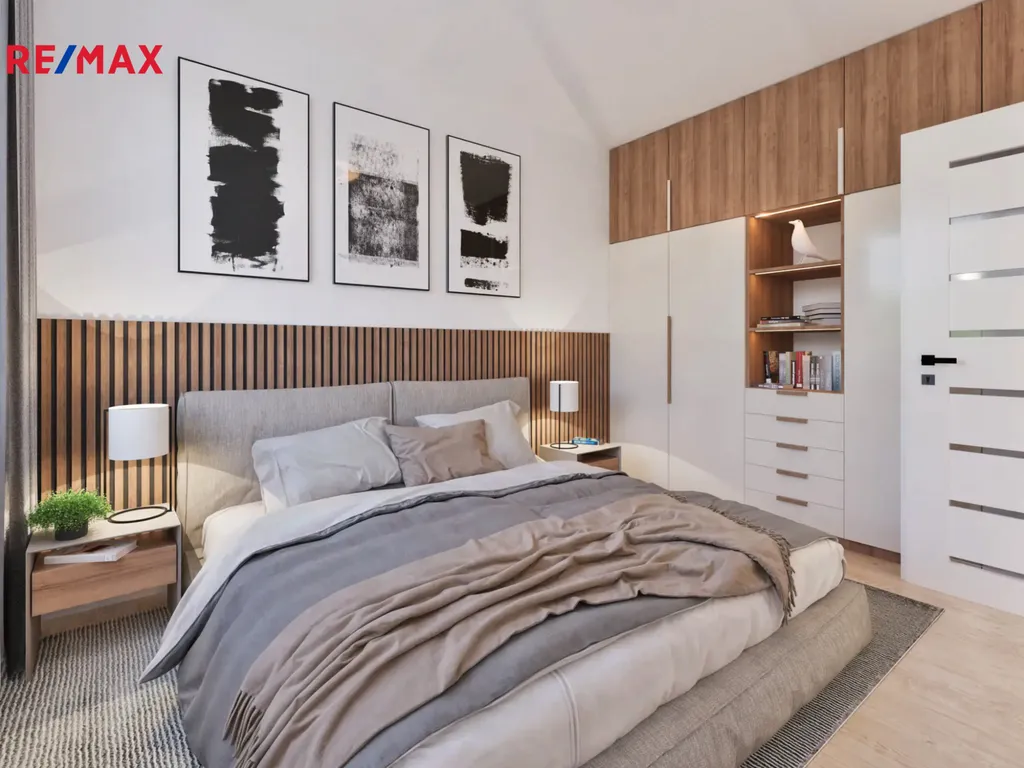 V přízemí domu bude vstupní chodba se schodištěm do patra, kde při vstupu budete mít po pravé straně koupelnu se sprchovým koutem a WC, na levé straně bude výklenek pro vestavěnou šatní skříň. Dále menší pokoj vhodný jako ložnice nebo pracovna. Rovně z chodby projdete do velkého obývacího pokoje, který bude spolu s velkým kuchyňským koutem a jídelnou dominantou celého domu. Z tohoto obývacího pokoje bude vstup na zahradu s terasou, kde si můžete postavit pergolou. Zahrada bude oplocená se zadní brankou pro pěší vstup. V chodbě domu pod schodištěm budete mít úložný prostor a v patře na vás budou čekat tři pokoje a hlavní koupelna s vanou a WC. Jako bonus vám zhotovíme plnohodnotnou velkou místnost v podkroví, kam povede běžné schodiště. Podkrovní pokoj bude mít všechny náležitosti jako jsou střešní okna, podlahovou krytinu, sádrokartonové podhledy i rozvody elektřiny. Tento podkrovní prostor můžete využít jako ložnici, pracovnu nebo hernu. Velkoformátová okna zajistí dostatek přirozeného světla a příprava na venkovní žaluzie umožní regulaci teploty v interiéru. Před domem budou dvě parkovací stání. Tepelné čerpadlo bude umístěné směrem do ulice.