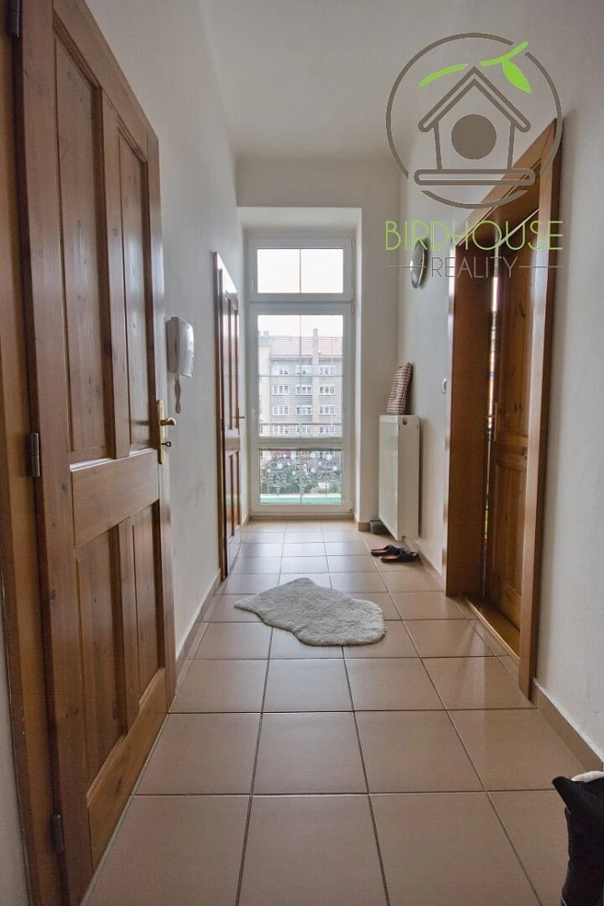 - Chodba (10,8 m²), ze které se dostaneme do pokoje č. 1, na samostatnou toaletu, do kuchyně, koupelny, komory a také na balkon, který nabízí příjemný výhled do vnitrobloku.