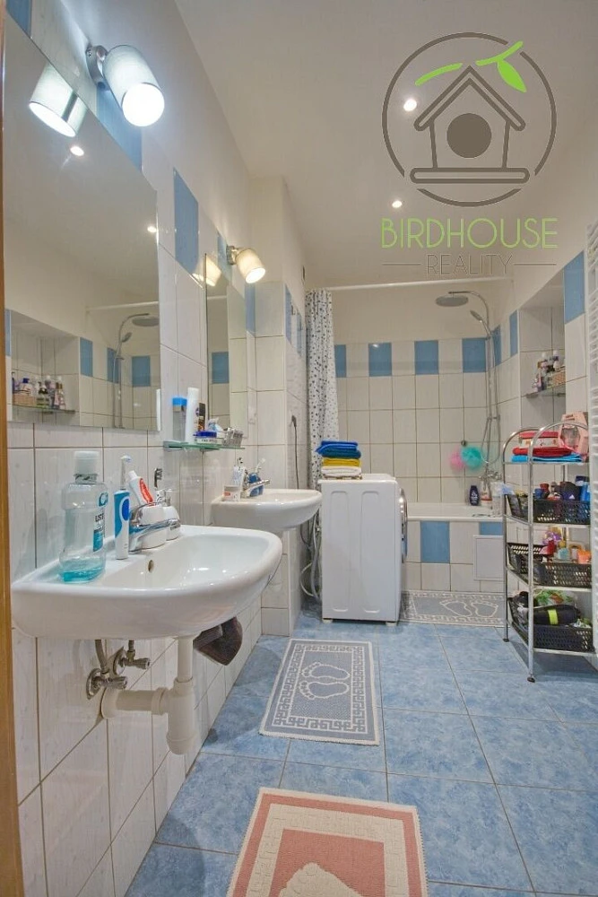- Koupelna (6,8 m²), která je zařízena vanou se sprchovací hlavicí, díky které si zde přijdou na své i příznivci sprch. Dále zda naleznete dvě umyvadla se zrcadly, žebřinové topení a samozřejmostí je také příprava na instalaci automatické pračky.