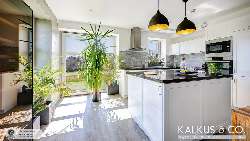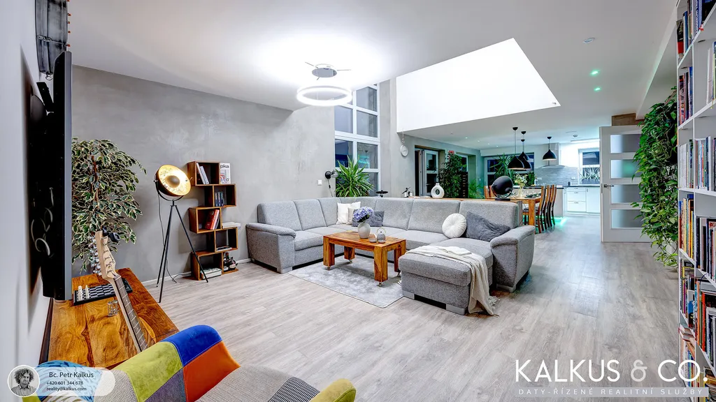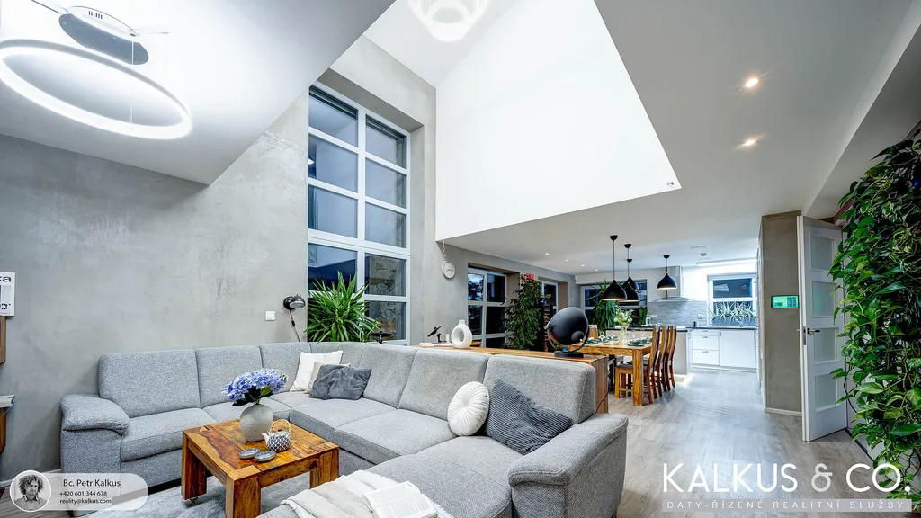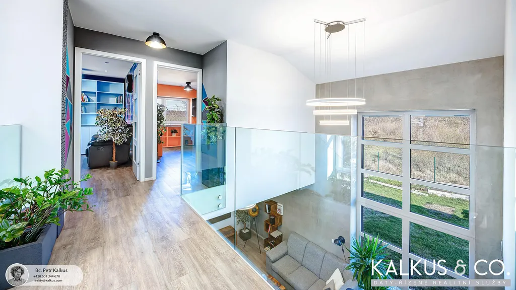 S dispozicí 6+kk a užitnou plochou 219 m² na rovinatém pozemku o výměře 1 530 m² nabízí tento dům zázemí i pro větší rodinu. Tři koupelny, wellness místnost s přípravou pro saunu, vysoké stropy a otevřený prostor napříč dvěma podlažími vytvářejí dojem volnosti a vzdušnosti. Děti mají v patře své soukromí, přesto galeriový průhled z horní chodby do obytného prostoru zajišťuje, že rodina zůstává v kontaktu – doslova i symbolicky.