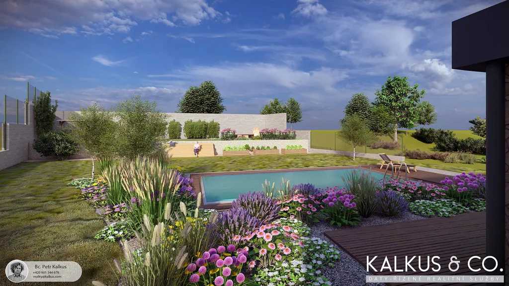 Zahrada obklopuje dům jako přirozené pokračování interiéru. Ocení ji nejen děti, ale i nadšenci do pěstování – díky rozloze a orientaci je připravena na sezónní rytmus zeleniny i relaxace. Samotný provoz domu se řídí přes inteligentní systém LOXONE, který automatizuje mimo jiné osvětlení, vytápění, venkovní žaluzie, přístupy, zabezpečení, multimédia i zavlažování. Dům se přizpůsobuje dennímu rytmu domácnosti a dokáže si i „zavolat pomoc“ – například při aktivaci požárních čidel nebo při simulaci přítomnosti při odjezdu na dovolenou.