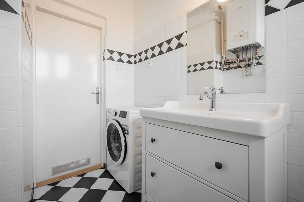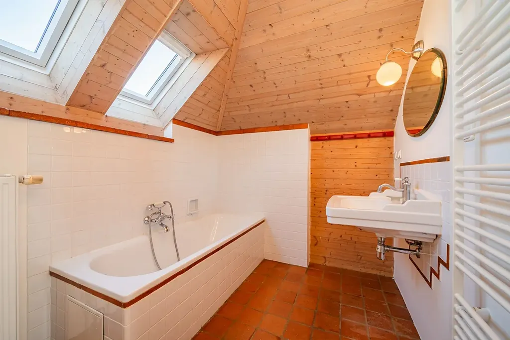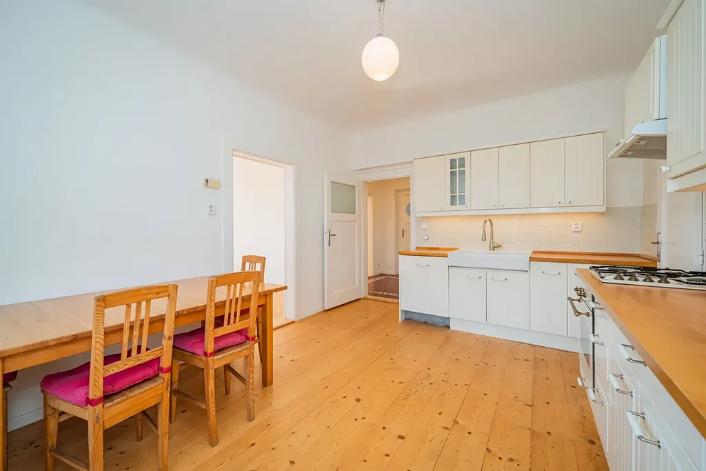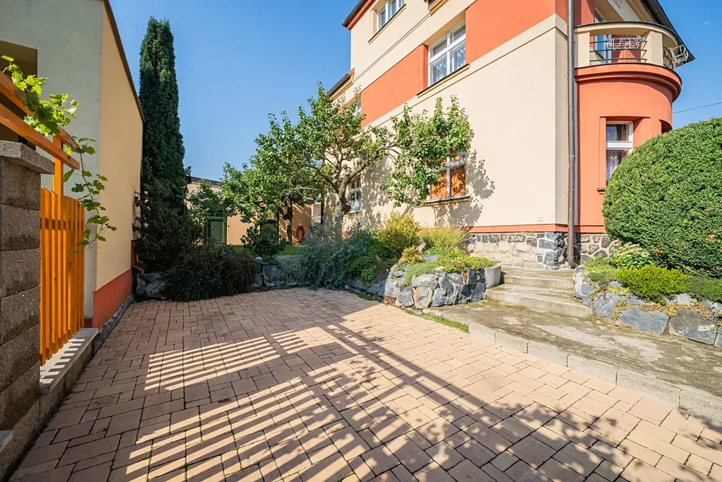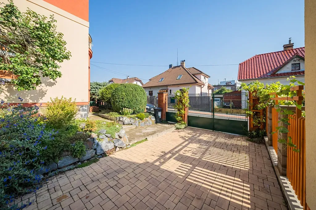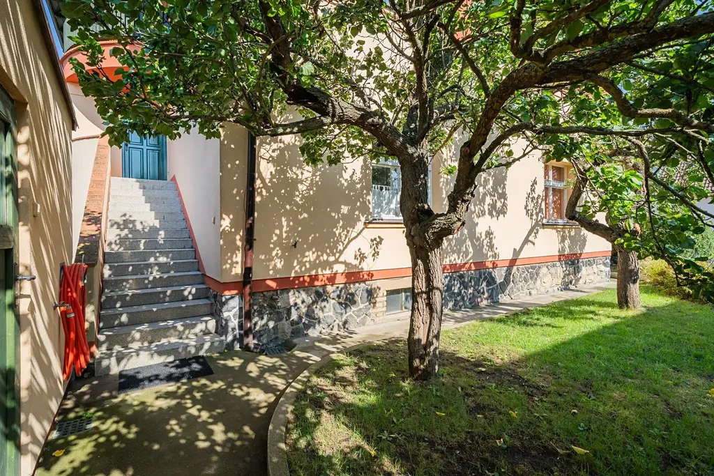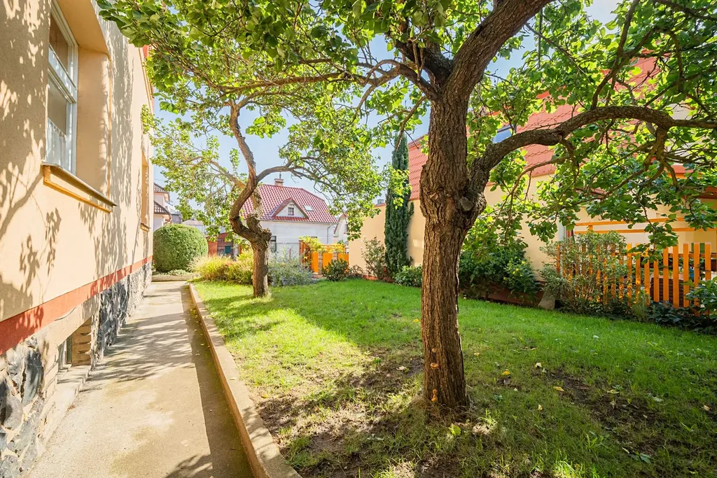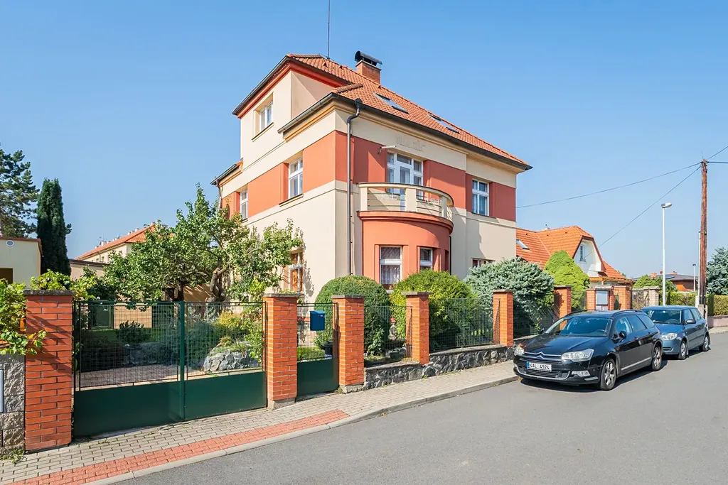 Byt má dispozici 5+1 s čistou obytnou plochou 150 m² a nabízí využitelnou půdu, sdílenou kolárnu, zastřešenou terasu, parkovací stání na vlastním pozemku a malou zahrádku na samostatném pozemku o velikosti 110 m². Vila prošla citlivou rekonstrukcí a zachovala si výrazné prvorepublikové prvky – kombinace historického šarmu s moderním komfortem.