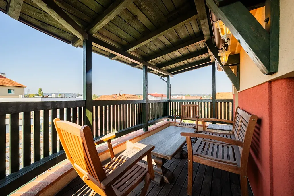 Mezipatro: Zastřešená terasa se sedacím nábytkem – ideální pro ranní kávu nebo večerní relax.