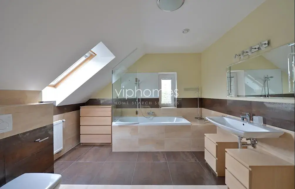 Nově postavený rodinný dům situovaný v rezidenční lokalitě s množstvím zeleně a dobrou dostupností do mezinárodních škol - cca 5 minut jízdy ke školám ISP nebo Riverside School.