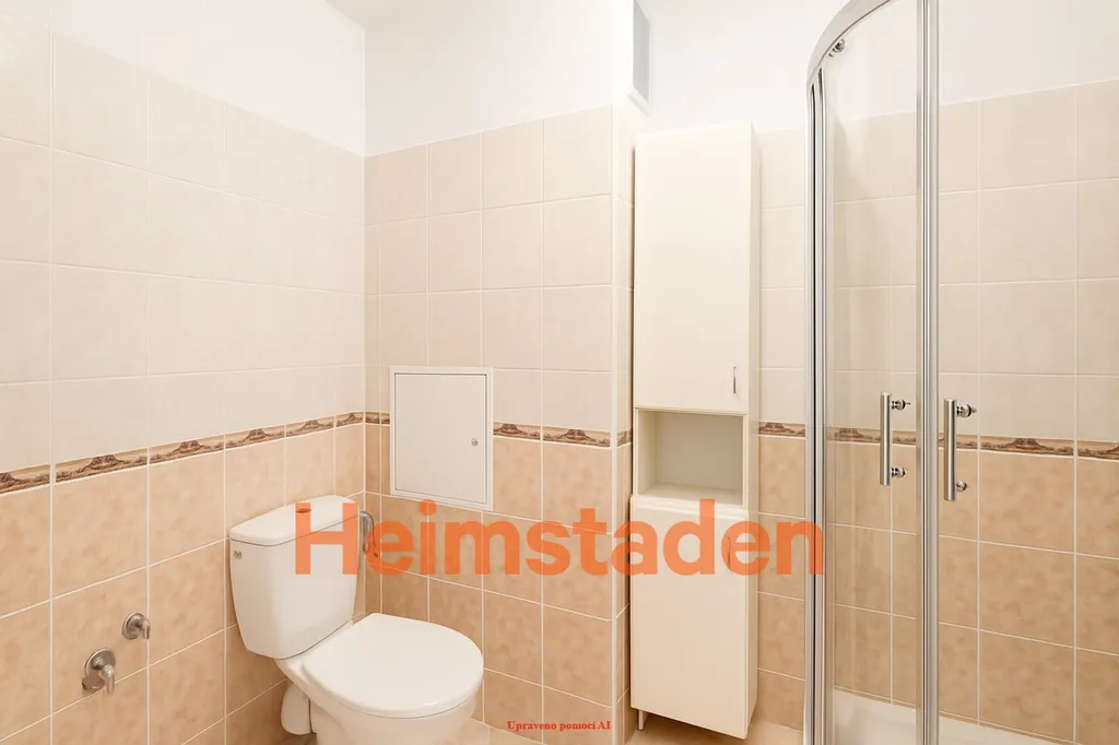 Byt má chytře upravenou dispozici – koupelna je spojená s toaletou a nabízí velký sprchový kout v jemných pastelových tónech, které vytvářejí příjemnou, klidnou atmosféru. Kuchyně byla zvětšena a poskytuje opravdu hodně prostoru, navíc s otevřenou komorou a přípojkou na pračku, takže praktičnost tu hraje hlavní roli. Kuchyňská linka ve světlém dřevodekoru je nadčasová a krásně ladí s lesklou světlou dlažbou, která pokračuje i v předsíni.