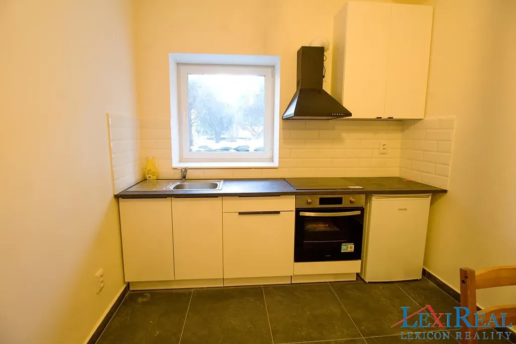 Kuchyňský kout je vybaven menší lednicí, kterou je možné po dohodě nahradit myčkou nádobí. Byt je nezařízený, vyjma vybavení zobrazeného na fotografiích, případně může být předán zcela vyklizený.