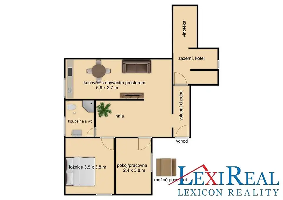 Byt disponuje prostornou vstupní halou, velkou technickou místností s možností využití například jako vinotéka, dále ložnicí, dětským pokojem či pracovnou a obývacím prostorem s kuchyňským koutem. Dispozice je ideální pro 23 osoby. Obytná plicha 60 m2, technické místnosti 11 m2.