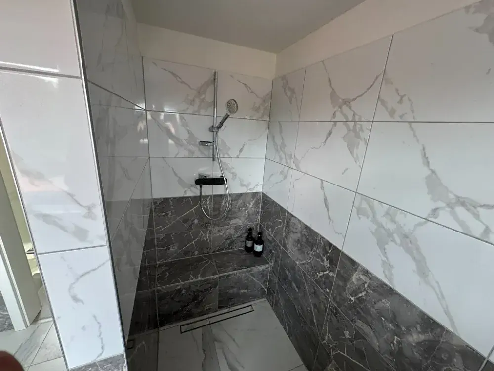 koupelně. V interiéru jsou použity současné materiály, například keramické dlažby velkého
