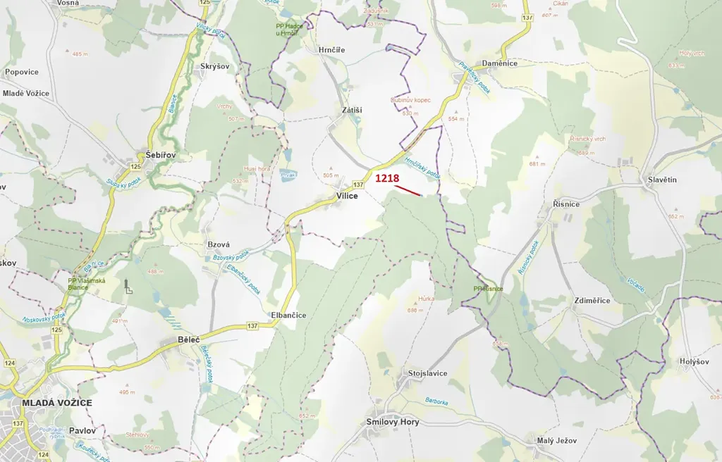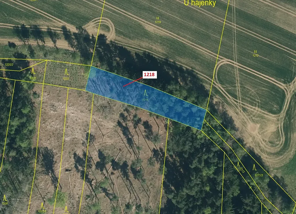 Lesní pozemek o výměře 1352 m2, parcelní číslo 1218, podíl 1/1, katastrální území Vilice, obec Vilice, obec s rozšířenou působností Tábor, okres Tábor, Jihočeský kraj. Po těžbě.