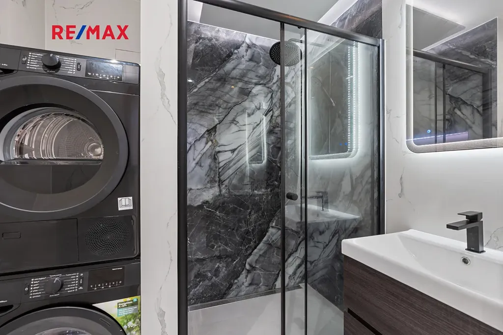 designová koupelna s velkoformátovým mramorovým obkladem, pračkou a sušičkou
