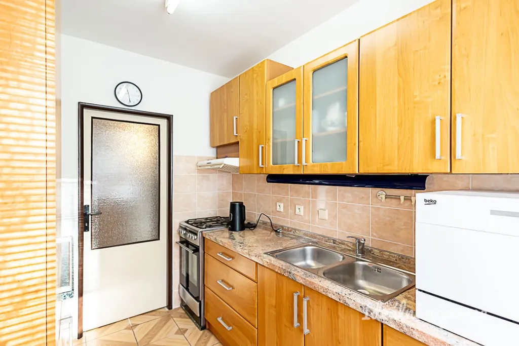 Interiér je nabízen jako částečně vybavený, což představuje ideální rovnováhu mezi připraveným zázemím a možností zařídit si domov podle vlastního vkusu. Kuchyně disponuje všemi potřebnými spotřebiči, jako je lednice s mrazákem, elektrická trouba, sporák a digestoř, přičemž nabízí i prakticky řešené úložné prostory. Centrem bytu je prostorný obývací pokoj vybavený pohodlnou sedací soupravou, televizí a jídelním koutem. Další dva samostatné pokoje jsou díky své neprůchozí dispozici velmi variabilní a lze je využít jako ložnice, dětský pokoj nebo klidnou pracovnu. Moderně řešená koupelna se sprchovým koutem a umyvadlem je doplněna o samostatnou toaletu.