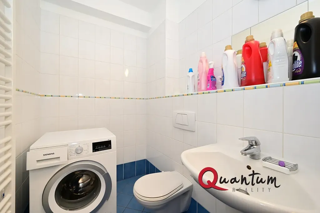 Dispozice zahrnuje vstupní halu s vestavěnou šatní skříní, prostorný obývací pokoj se sedací soupravou a rozkládacím jídelním stolem se židlemi, navazující na plně vybavený kuchyňský kout s vestavěnými spotřebiči (sklokeramická varná deska, elektrická trouba, myčka nádobí, lednice s mrazákem). Dále je k dispozici ložnice (nezařízená) a druhý pokoj s vestavěnými skříněmi a velkým pracovním stolem. Koupelna je vybavena vanou, WC a dvěma umyvadly, dále je zde samostatné WC s umyvadlem a pračkou. Praktickým benefitem je také komora přímo v bytě.