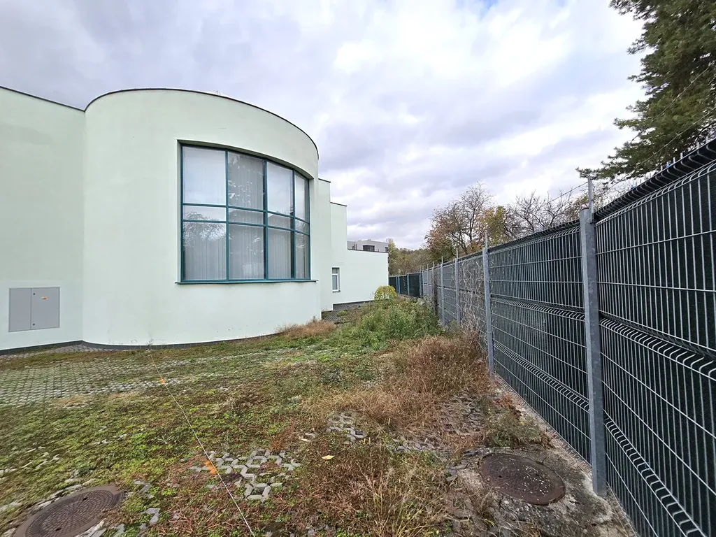 Kancelář v 1. patře má reprezentativní vstupní prostor s přístupem otevřenou prosklenou halou s kruhovým schodištěm. K budově přiléhá venkovní zpevněná plocha k parkování 20 aut na uzavřeném oploceném vlastním pozemku (cca 500 m2), se samostatnou vjezdovou bránou.