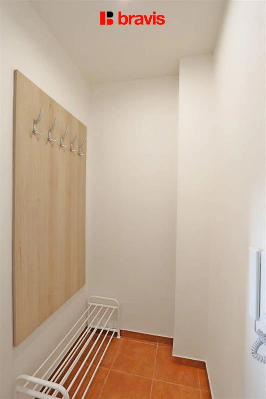 Vstup do bytu zajišťují bezpečnostní dveře a v zádveří je věšák na bundy a menší botník.