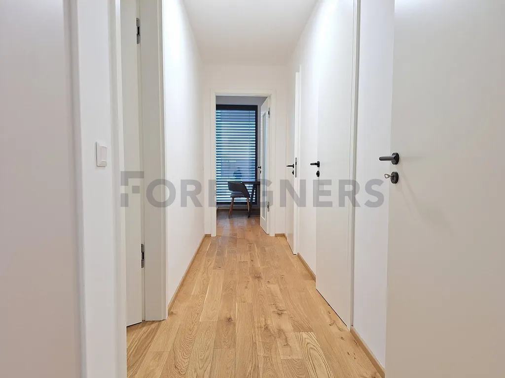 Byt je vybaven moderní kuchyňskou linkou s indukční varnou deskou, dřezem, myčkou, vestavěnou troubou, mikrovlnnou troubou a lednicí s mrazákem. Prostorný obývací pokoj se vstupem na balkon. Ložnice s manželskou postelí s matrací, komodou a křeslem. V koupelně se nachází sprchový kout, umyvadlo se skřínkou a topný žebřík. V předsíni je skříňová sestava. Podlahy jsou pokryty dřevěnými parketami, okna jsou plastová s izolačními dvojskly.