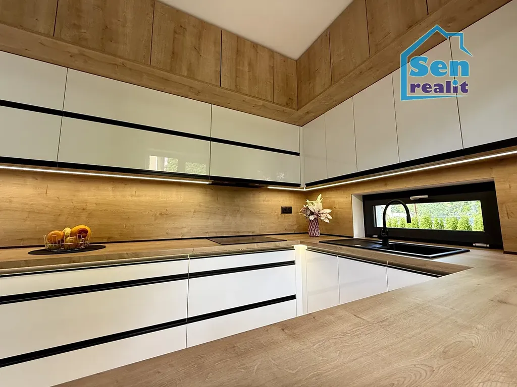 Podsvícená kuchyňská linka na míru s vestavěnými spotřebiči (indukční varná deska, elektrická trouba, myčka, mikrovlnná trouba, lednice, vestavná digestoř) a s maximem úložných prostor