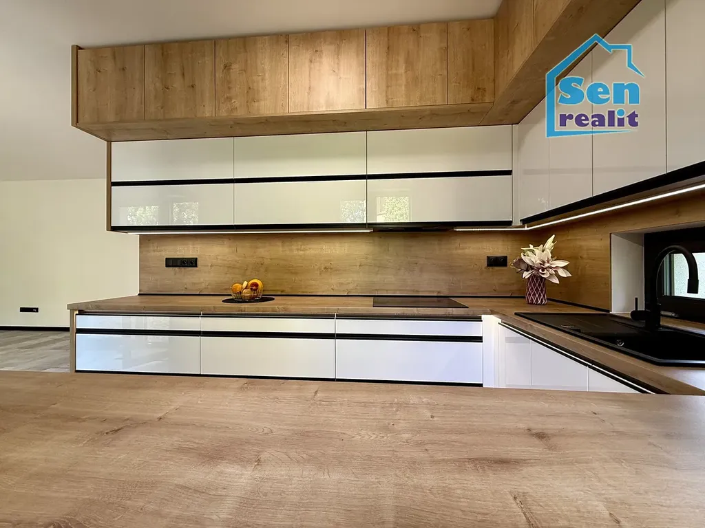 Plovoucí podlahy, stropní světla s možností volby intenzity jasu, dveře v dekoru dřeva, dřevěné parapety