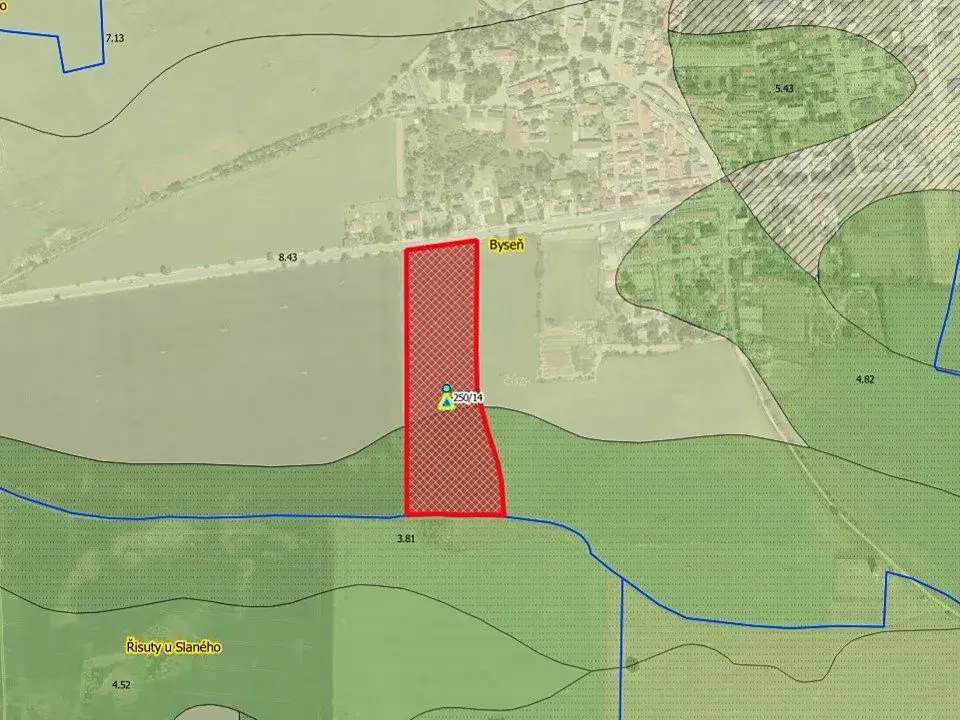 Nabízíme k prodeji pozemek v k.ú. Byseň p.č. 250/14, zapsaném na LV 490 o výměře 28.748 m2. Pozemek přímo sousedí s parcelou č. 249, která je dle platného ÚP (změna č. 1 za 2020) určená k využití OS - plochy občanského vybavení - sport. S obcí a odborem územního plánovaní ve Slaném projednáváme změnu ÚP, kde by na časti našeho pozemku 250/14 (cca 8000 m2) bylo možné využití OV - plochy občanského vybavení nebo VS - plochy smíšené výrobní. V dolní části pozemku je plánovaný obchvat obce (R2), nicméně tento obchvat zatím nemá známou dobu realizace. Bonita pozemků je třídy 4 a 5. Vyjmutí z půdního fondu bude v budoucnu bezproblémové a bude velmi nízké. Na hranice pozemku je trafostanice, kde je možné se připojit nebo vyvést výkon případné FVE. Z výše uvedeného se jedná o velmi zajímavou investiční příležitost. Pozemek je propachtován místnímu zemědělci. Výpovědní lhůta činí jen 1 rok.