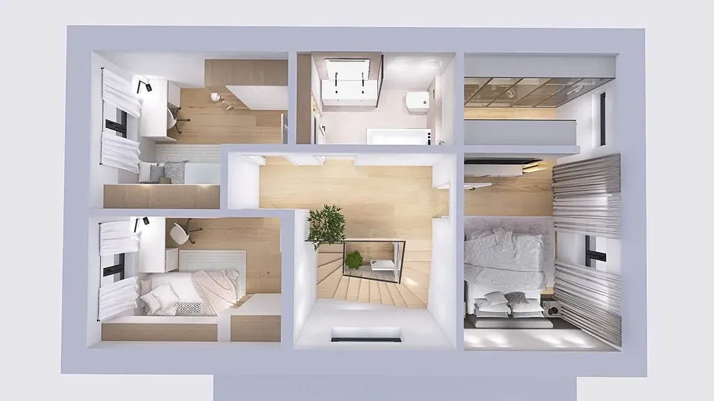 Ve 2. nadzemním podlaží (49,47 m²) se nachází chodba (7,07 m²), pokoj (9,91 m²), druhý pokoj (10,28 m²), koupelna (4,26 m²) a ložnice se šatnou (17,95 m²).