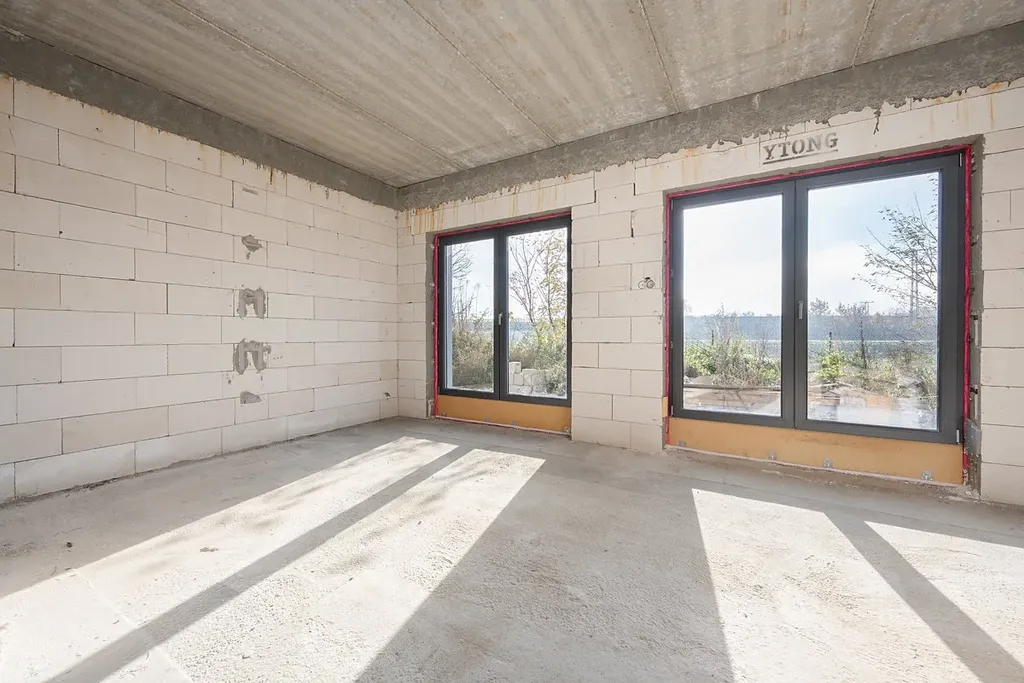 Dům je aktuálně ve fázi rozestavěnosti – jsou dokončeny rozvody vody a elektřiny, ale chybí finální omítky, podlahy, obklady a zařizovací prvky. To umožňuje budoucímu majiteli dokončit interiér podle vlastního vkusu a potřeb – od výběru materiálů až po finální design kuchyně a koupelny.