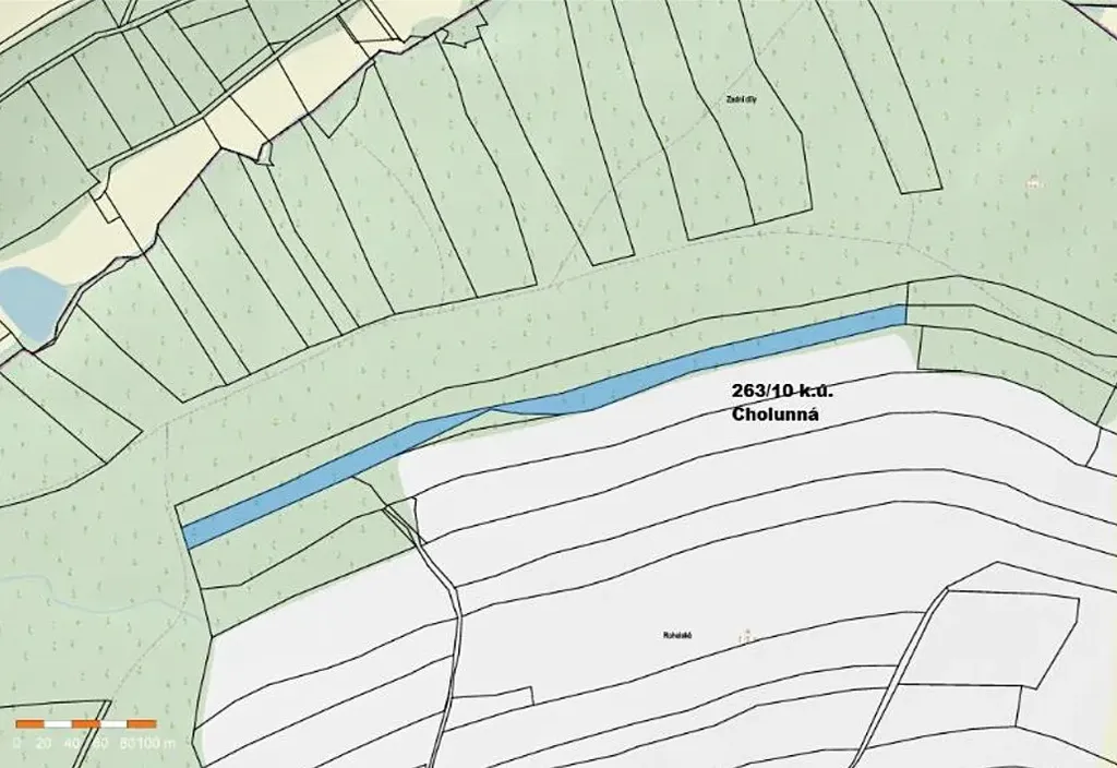 Jedná se o lesní pozemek menší výměry, úzkého protáhlého tvaru. Nachází se na okraji lesního komplexu mezi privátními pozemky.