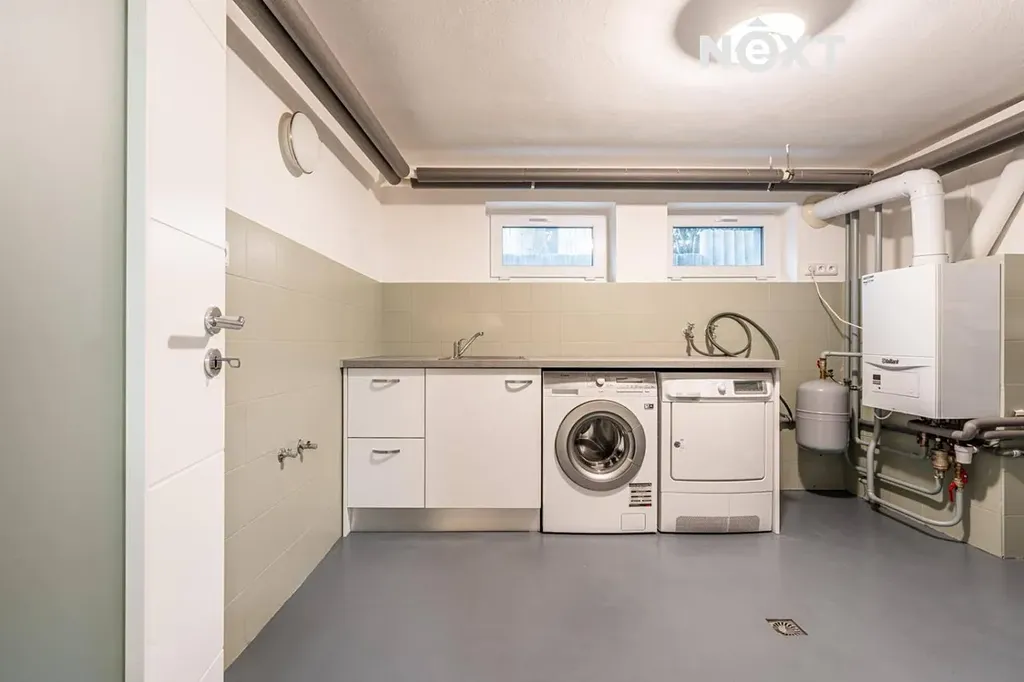 Přízemí je řešeno jako samostatné rodičovské apartmá s ložnicí, pracovnou, šatnou, koupelnou, zimní zahradou a přímým vstupem na zahradu. K dispozici je také technická místnost a vybavená prádelna.