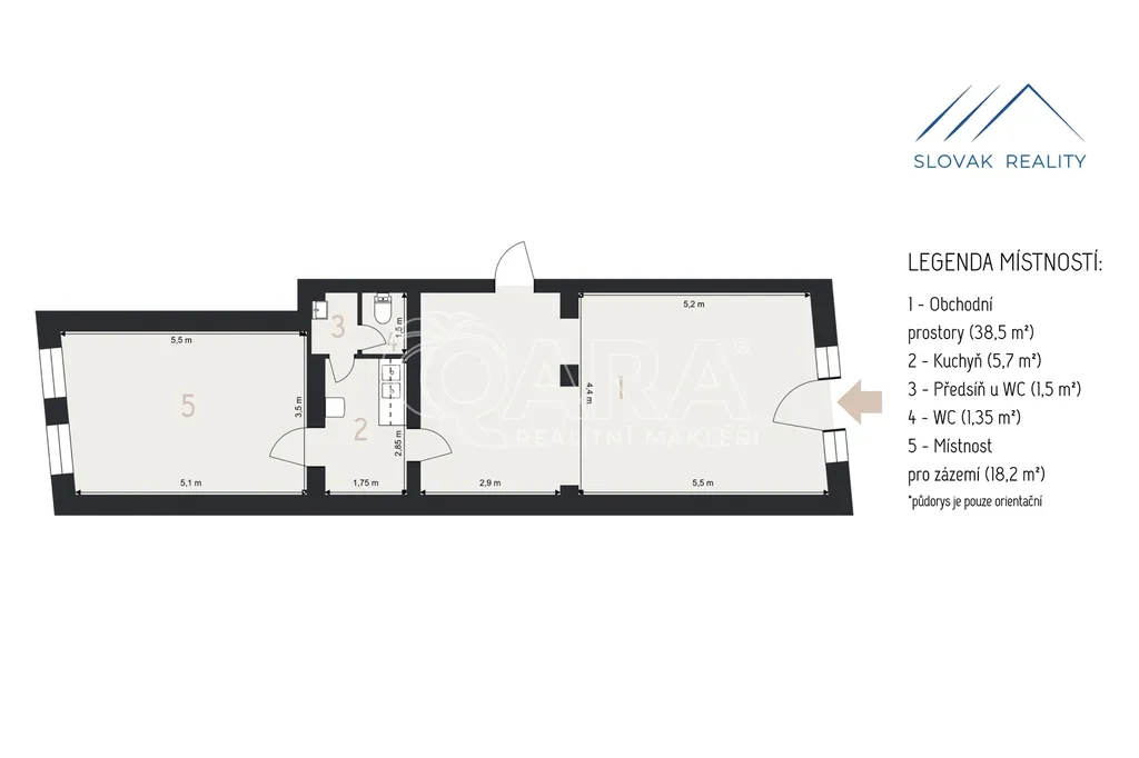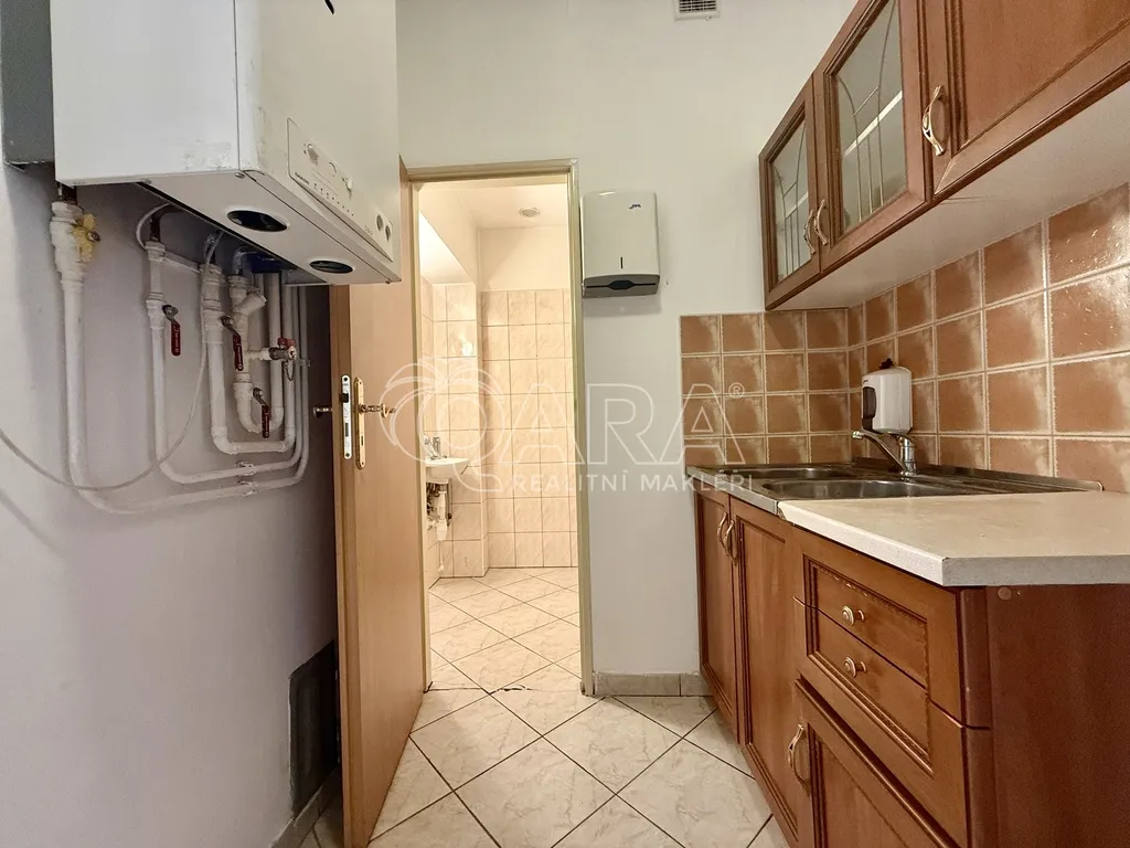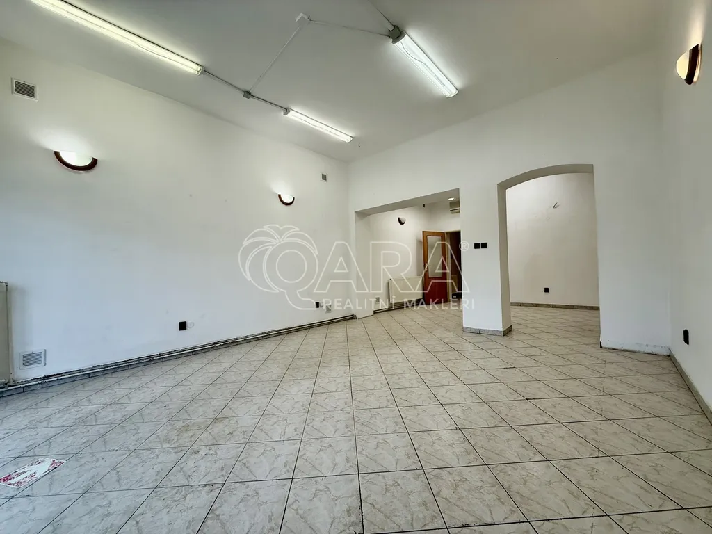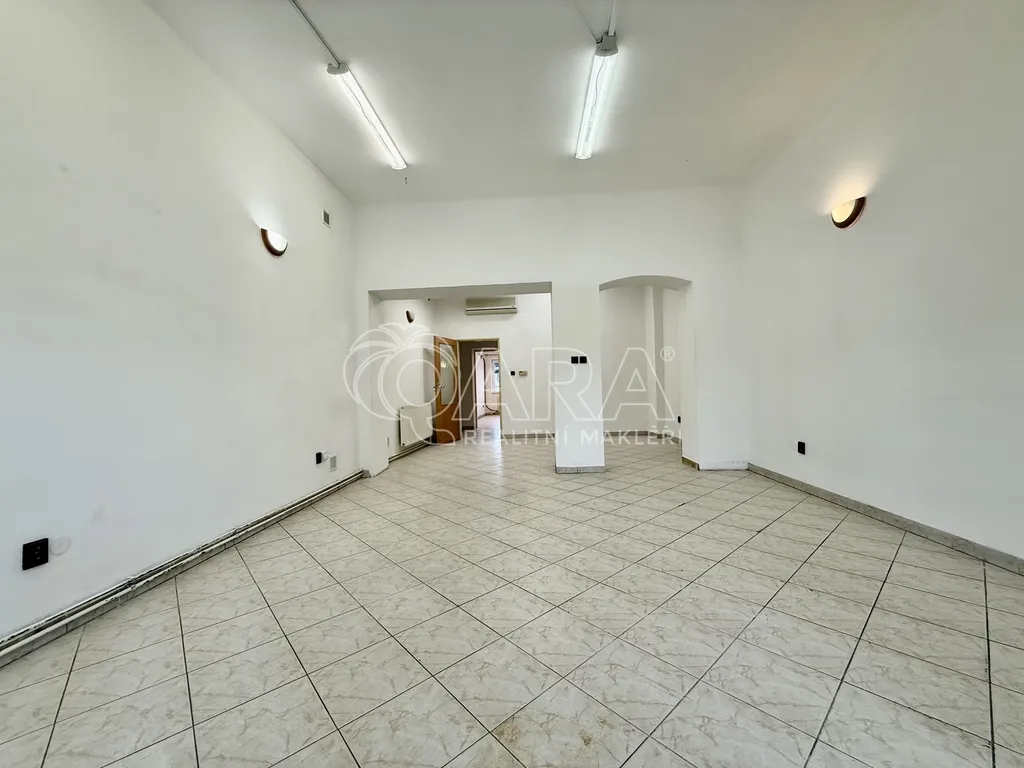 Prostor má praktické a přehledné dispoziční řešení. Hlavní místnost o výměře 38.5 m2 nabízí otevřený a světlý prostor vhodný pro provozovnu, kancelář nebo obchod. Na ni navazuje druhá samostatná místnost o velikosti 18 m2, kterou lze využít jako další prodejní část, kancelář, zázemí nebo sklad. Součástí prostoru je kuchyňka o výměře 5.7 m2 a sociální zázemí s WC a umyvadlem o celkové ploše 2.85 m2.