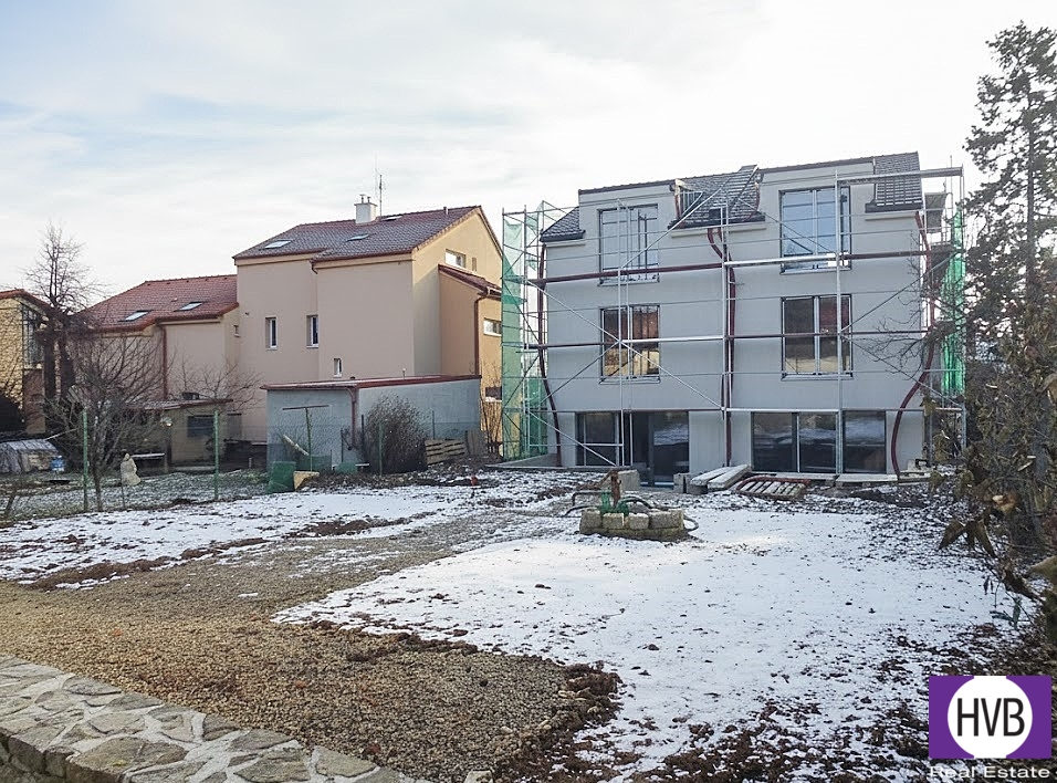 Prodej novostavby rodinného dvojdomu o 2 NP + podkroví , hrubá podlažní plocha 340 m2, pozemek 596 m2, Praha 5 - Stodůlky. Dvojdům je tvořen dvěma zrcadlově otočenými samostatnými budovami. Každá polovina o dispozici 5+kk a užitné ploše 123,50 m2 má vlastní přípojky inženýrských sítí a bude mít své číslo popisné a příslušnou část pozemku s vlastní retenční nádrží a polovinou vedlejší stavby v zadní části pozemku. Dvojdům je aktuálně ve fázi hrubé stavby. Je zateplený 16 cm polystyrenem, má osazena okna s izolačními trojskly, je připojen k městské kanalizaci. Vnitřní elektrické rozvody jsou před dokončením a je udělána příprava na rozvod vody a plynu, dále přípojky na klimatizaci a příprava na kuchyňské linky. Vytápění každé poloviny je plánováno vlastním plynovým kondenzačním kotlem, v 1. NP je navíc příprava na podlahové topení.