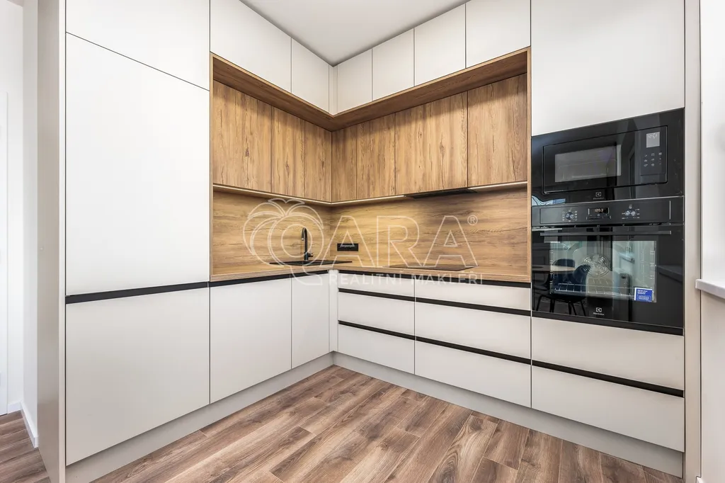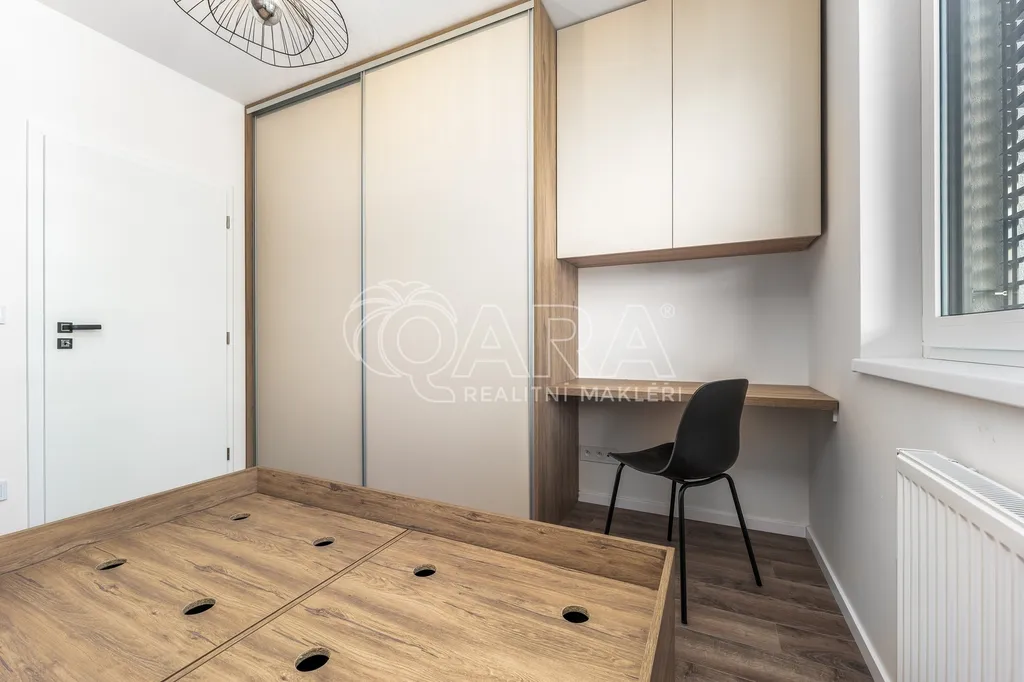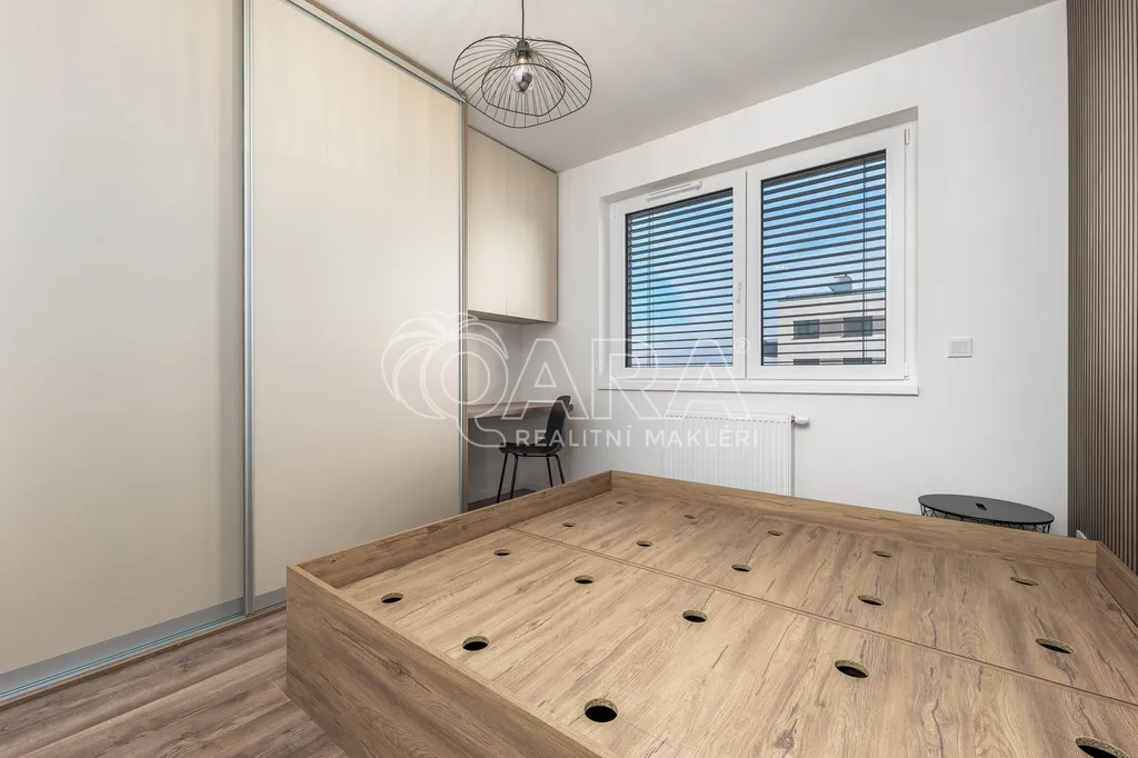 Nadstandardní byt disponuje podlahovou plochou 63 m2 plus lodžie a nachází se v 5. nadzemním podlaží nově dokončovaného projektu Výhledy Barrandov. Součástí vybavení je na míru zhotovená kuchyňská linka s vestavěnými kvalitními spotřebiči (indukční varná deska, mikrovlnná trouba a myčka, zabudovaná digestoř, lednice, mrazák). Koupelna s vanou, úložnými prostory a pračkou se sušičkou. Samostatná toaleta s umyvadlem. Komora, která nabízí další úložný prostor nebo ji lze využít jako šatnu. Dostatek úložného prostoru zabezpečují veškeré skříně, které jsou umístěny v předsíni, koupelně a ložnici. Součástí vybavení je také dvoulůžko v ložnici a další nábytek jako je nová sedací souprava, televize, jídelní stůl, židle. Druhá ložnice záměrně bez vybavení. Možno vybavit jako pracovnu, posilovnu či dětský pokoj. Obě ložnice mají výhled do klidného vnitrobloku. Obývací pokoj s lodžií je orientován do zeleně. K plnému využití máte k dispozici sklep, komoru v bytě a ještě jednu komoru v budově. O úložné prostory je tak náležitě postaráno. K bytu náleží garážové parkovací stání. V domě je k dispozici také kočárkárna / kolárna.