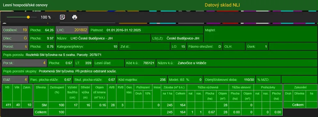 Jedná se o p.č. 2078/71 vedená jako lesní pozemek o celkové výměře 7 567 m2. Stáří lesa a LHO viz. foto.