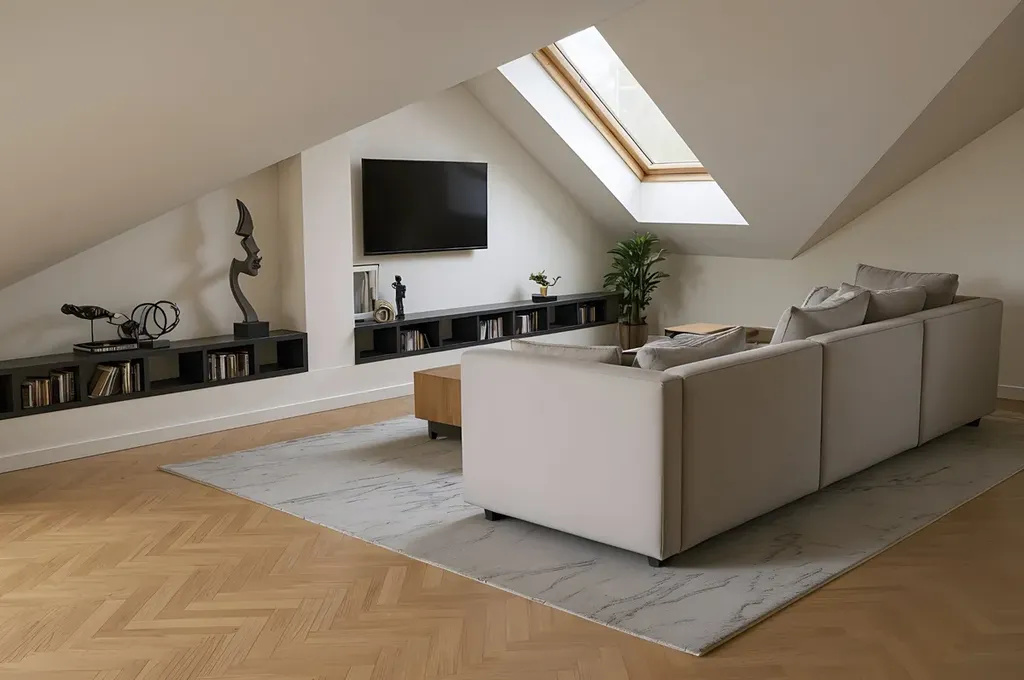 Vstupní úroveň bytu tvoří chodba a prostorná koupelna se sprchovým koutem. Atypické kk je prakticky rozděleno do kuchyňské části a střešní okna pomyslně oddělují spací část. Byt je již dokončen. Kuchyň není součástí dodávky.