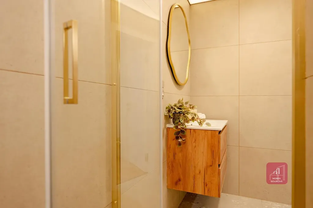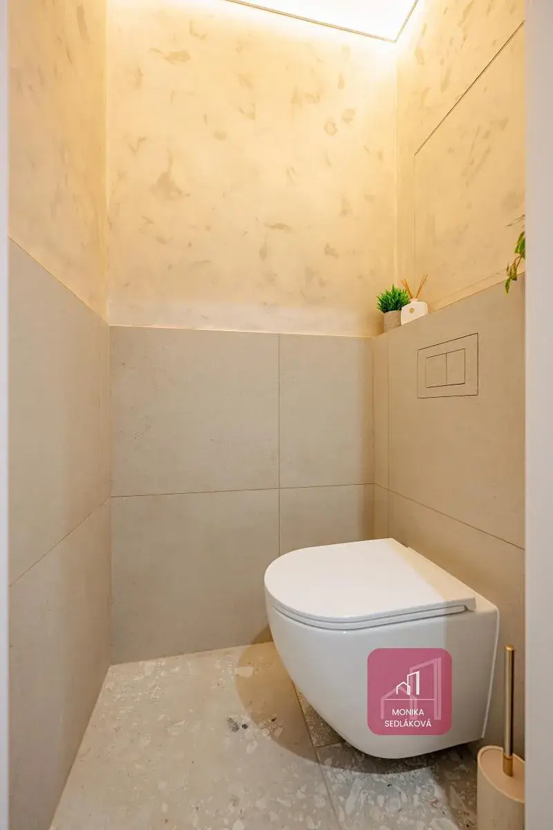 Koupelna s prostorným sprchovým koutem 5 m2, umyvadlem a přípravou na pračku a sušičku. Samostatná toaleta 1 m2.