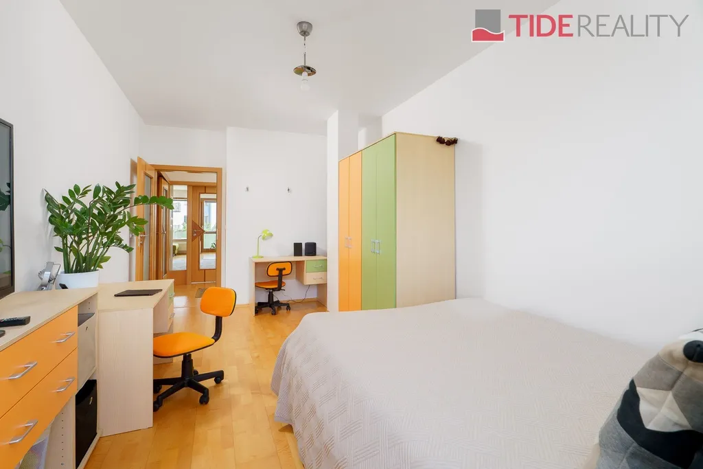 Za bezpečnostními vstupními dveřmi vcházíte do předsíně (18m2) se samostatnou prostornou šatnou a s velkou vestavěnou skříní. Z centrální chodby jsou vstupy i do všech místností v bytě: do třech ložnic (18, 17 a 16m2), koupelen a dále do velmi světlého obývacího pokoje s kuchyní (34m2) propojeného s prostorným balkonem (2m x 4,8m), kam se vejdou i pohodlná křesílka a případně i gril. Všechny ložnice jsou orientované na sever do zeleně, nabízí tak uklidňující a ničím nerušený výhled do lesoparku a hlavně klidný spánek při otevřeném okně. Tento byt má dále k dispozici 2 koupelny. Koupelna se sprchou, umyvadlem a WC se nachází u hlavní ložnice, ostatní pokoje (dětské pokoje) sousedí s koupelnou vybavenou vanou, dvěma umyvadly, WC a přípojkami na na pračku a sušičku. V celém bytě jsou dřevěné plovoucí podlahy, dř. EURO okna s vnitřními žaluziemi a klimatizace DAIKIN se splitovou jednotkou umístěnou v centrální chodbě a obývacím pokoji.