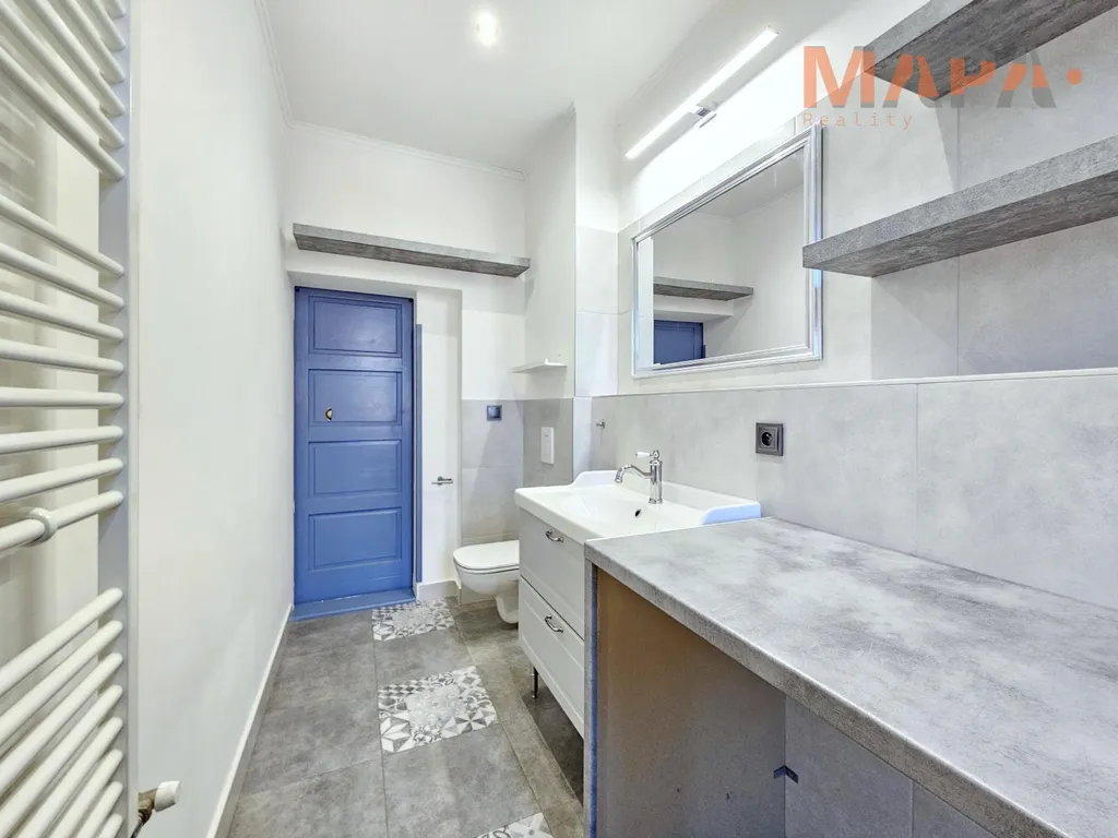 Kuchyně je vkusně zpracovaná v nadčasovém stylu s dostatkem úložného prostoru a kvalitními spotřebiči. Díky mezonetovému řešení byt působí velmi vzdušně a nabízí dostatek soukromí i prostoru pro jednotlivce, rodinu nebo práci z domova.