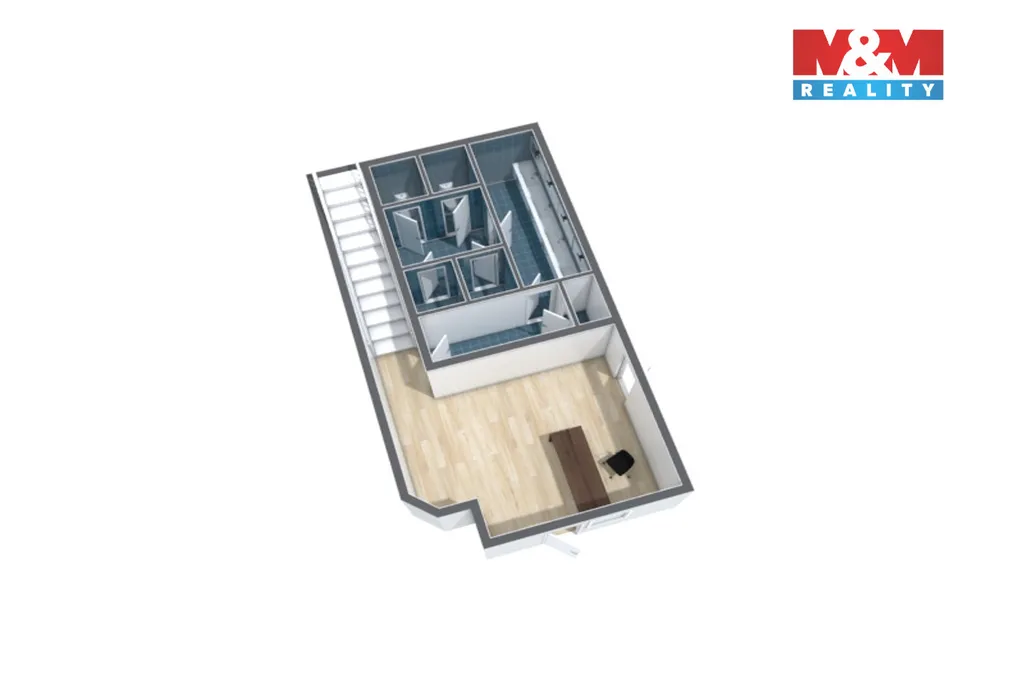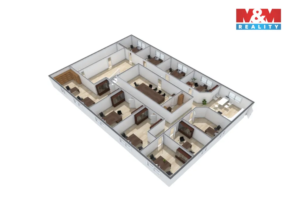 Dispozice je ideální pro větší firmu nebo dynamicky se rozvíjející tým. Prostory zahrnují 10 samostatných kanceláří, zasedací místnost, recepci, kuchyňku, sklad a kompletní sociální zázemí. Významným benefitem jsou dva samostatné vstupy do budovy, které umožňují praktické provozní oddělení jednotlivých částí.
