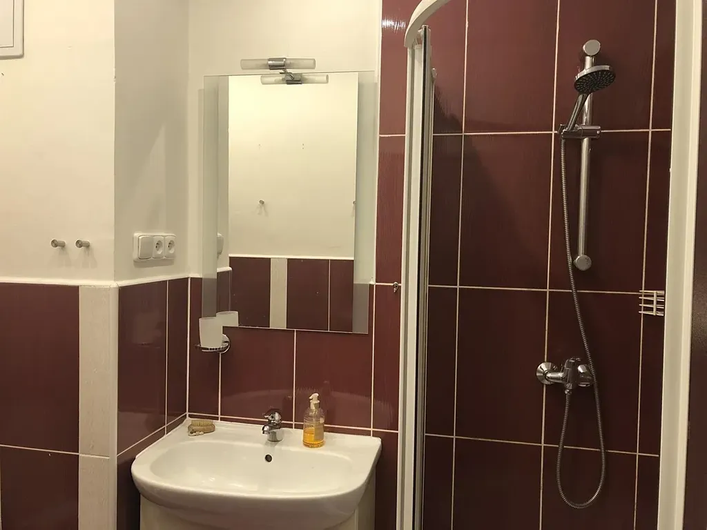 Dispozice: předsíň s velkou vestavěnou skříní, koupelna se sprchovým koutem a WC, vlevo obývací pokoj s kuchyňským koutem, vpravo ložnice s balkonem.