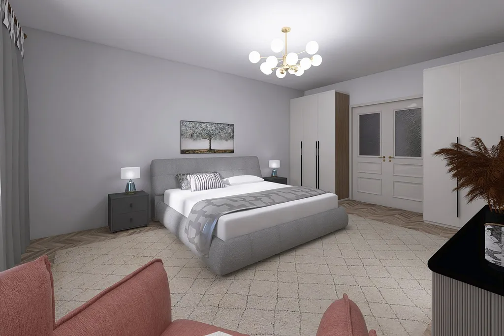 Mezi fotografiemi najdete také vizualizace, jak by mohl byt vypadat po rekonstrukci – inspirujte se a proměňte tento prostor v moderní a útulný domov podle svých představ.