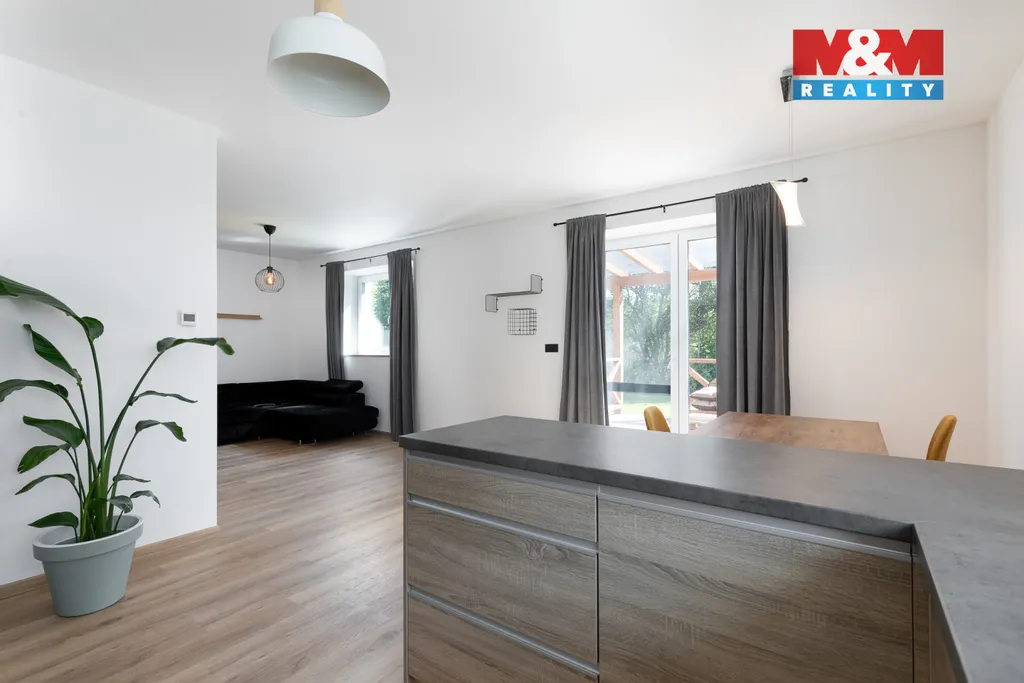 Kompletně vybavená designová kuchyně s vestavěnými spotřebiči, podlahové vytápění v kombinaci s kachlovými kamny, dvě koupelny, praktická šatna, efektivně řešený prostor pro prádelnu v patře, sklep i technické zázemí pro zahradní náčiní elegantně ukryté pod terasou.