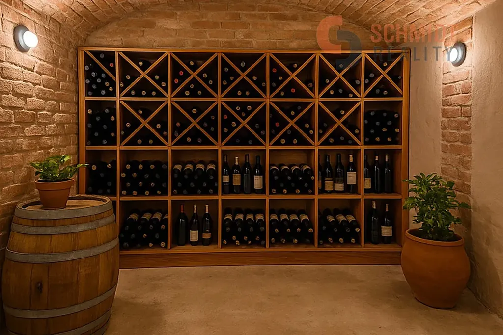 Dům je aktuálně jednopodlažní, nemovitost je částečně podsklepená a nabízí stylové klenuté vinné sklepy, které podtrhují jedinečný charakter domu a poskytují široké využití – od skladování vína až po příjemné posezení.