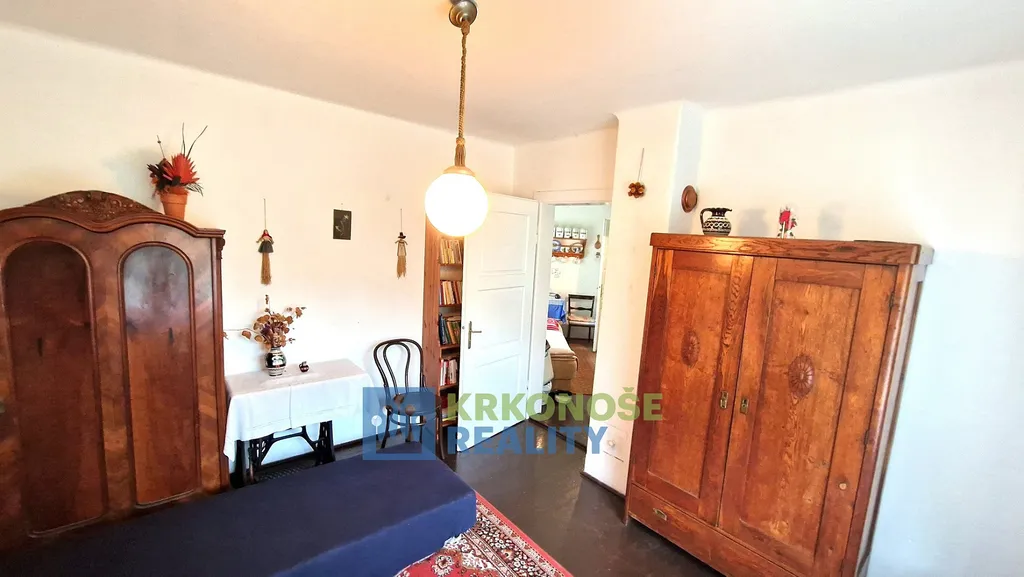 Zděný dům z roku 1936 působí poctivě a mile – má své příběhy a čeká na další. Uvnitř se nachází přízemí s verandou, kuchyní s jídelním koutem, útulným pokojem, koupelnou s vanou i praktickou kotelnou. Po dřevěném schodišti se vystoupá do podkroví, kde jsou dvě ložnice, předpokoj a malé WC – prostor, kam ranní světlo vstupuje skrze okna s výhledem do korun stromů.