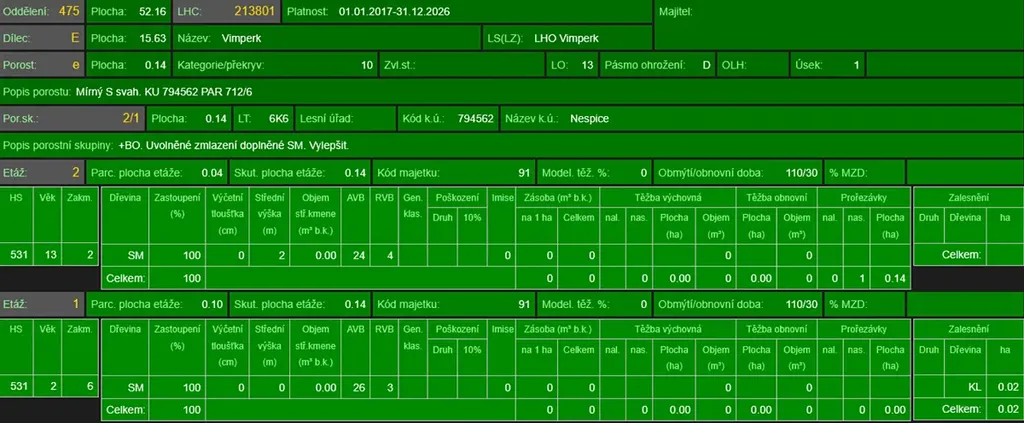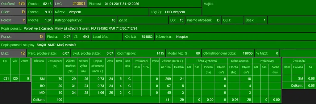- p.č. 712/6 vedená jako lesní pozemek o celkové výměře 1 393 m2 (stáří lesa 22 a 11 let - zastoupení dřevin smrk),