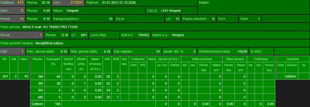 - p.č. 712/85 vedená jako lesní pozemek o celkové výměře 1 604 m2 (stáří lesa 11 let - zastoupení dřevin smrk, bříza, borovice, modřín),