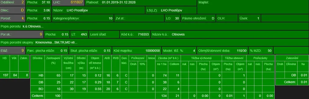 - p.č. 620/45 vedená jako lesní pozemek o celkové výměře 1 464 m2 (stáří lesa 91 let - zastoupení dřevin habr, dub, borovice)