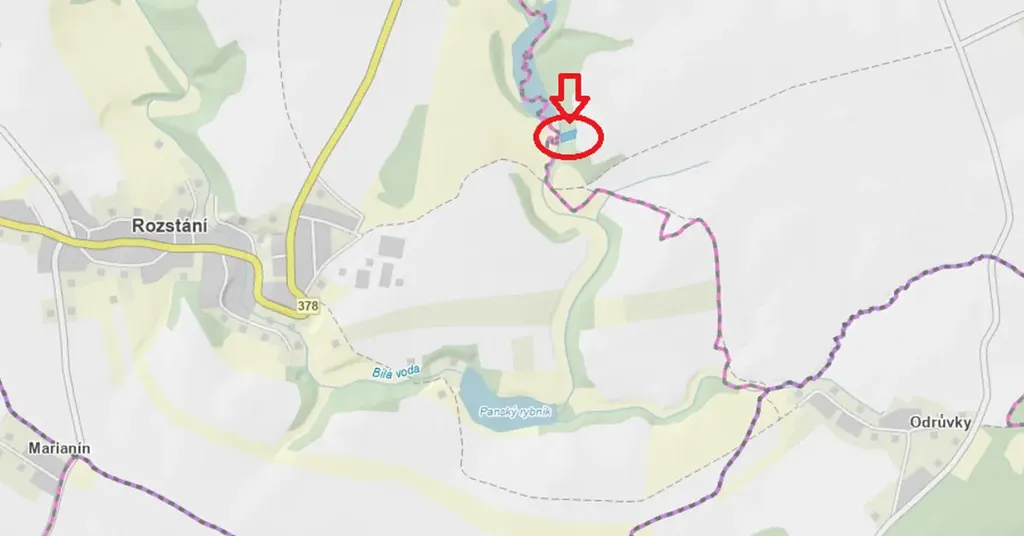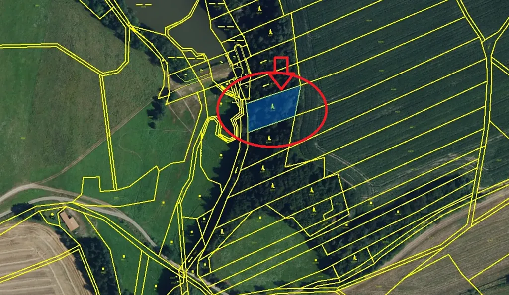 Přístup na pozemek přes pole. Pozemek je ve svahu (horní strana - pole, dole - potok)