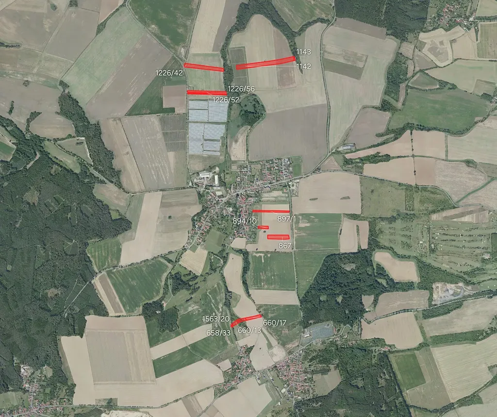 Pozemky jsou vedeny na těchto parcelních číslech: 601/2, 658/33, 660/13, 660/17, 867, 894/10, 897/1, 1142, 1143, 1226/42, 1226/52, 1226/56, 1563/20.