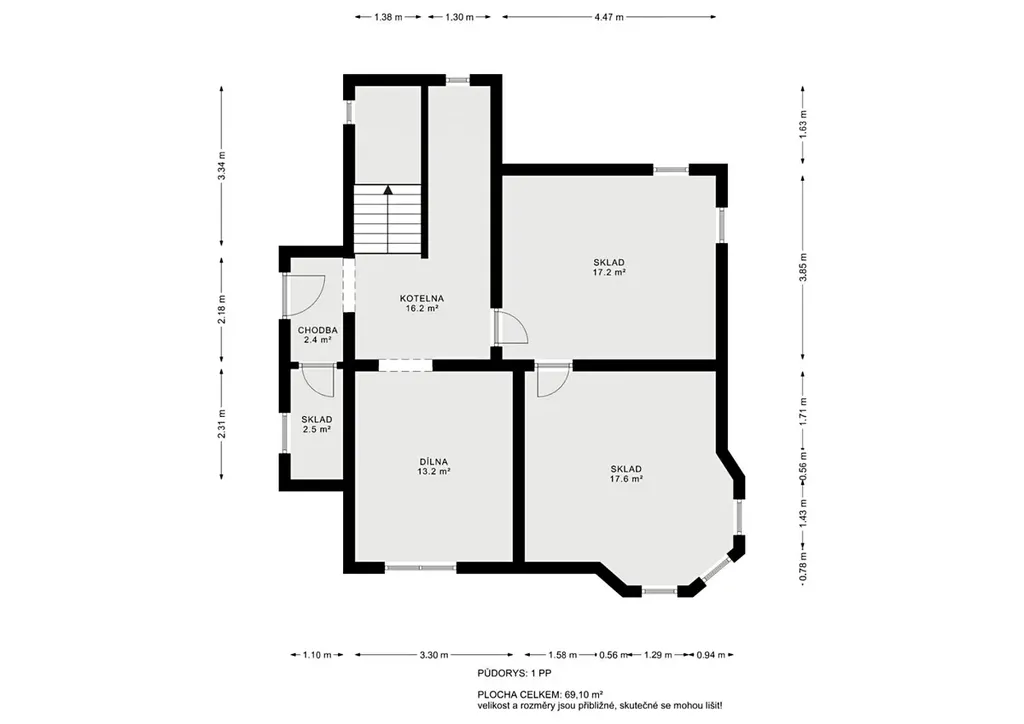 Dům disponuje celkovou podlahovou plochou přibližně 225 metrů čtverečních rozdělených do tří podlaží. V suterénu se nachází kotelna, dílna a prostorné sklady, které nabízejí dostatek úložného prostoru. První nadzemní podlaží tvoří obývací pokoj, pokoj, kuchyně se spíží, koupelna, WC a hala. Druhé nadzemní podlaží nabízí další obývací pokoj, dva pokoje, kuchyni se spíží, WC a sklad. Půdní prostor o výměře 51 metrů čtverečních je možné využít k dalšímu rozšíření obytné plochy, například vybudováním dalšího obytného podlaží nebo ateliéru.