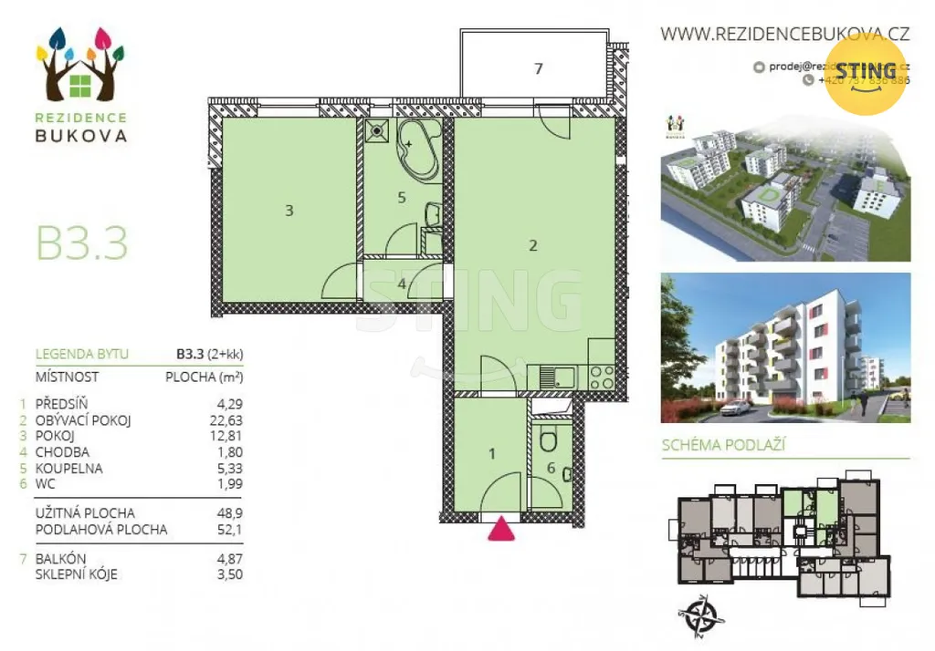 Byt o celkové podlahové ploše cca 52 m² je umístěn ve 2. patře (3. NP) domu s výtahem. Dispozice zahrnuje obývací pokoj s kuchyňským koutem, samostatný pokoj, chodbu, koupelnu a samostatné WC. K bytu náleží také komora/kóje umístěná na stejném patře. U domu je bezproblémové parkování a okolí nabízí možnosti příjemných procházek do přírody, jelikož se dům nachází v klidné části na okraji města.